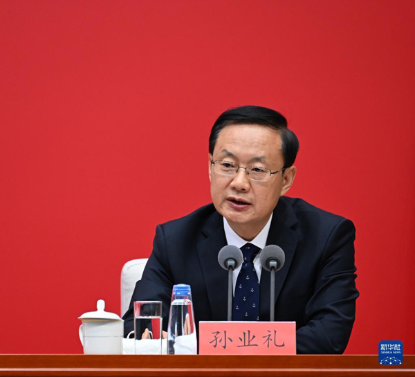 10月24日上午,中共中央舉行新聞發(fā)布會,介紹解讀黨的二十大報告。中央政法委秘書長陳一新,中央政策研究室主任江金權(quán),中央改革辦分管日常工作的副主任、國家發(fā)展改革委副主任穆虹,中央紀(jì)委國家監(jiān)委宣傳部部長王建新,中央辦公廳副主任兼調(diào)研室主任唐方裕,中央宣傳部副部長孫業(yè)禮等有關(guān)方面負(fù)責(zé)人解讀黨的二十大報告并回答記者關(guān)心的問題。這是孫業(yè)禮在新聞發(fā)布會上。新華社記者 金良快 攝