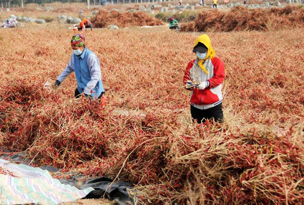 工人在白腦包鎮(zhèn)辣椒產(chǎn)業(yè)示范園初選辣椒。(新華社記者李云平 攝)
