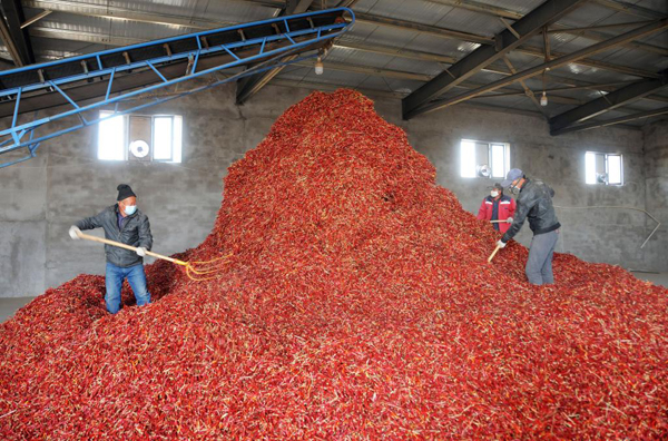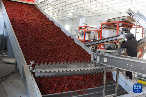 工人在白腦包鎮(zhèn)辣椒加工廠粗加工辣椒。(新華社記者李云平 攝)