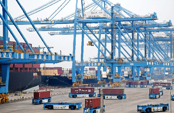 作業(yè)中的山東港口青島港全自動化集裝箱碼頭。