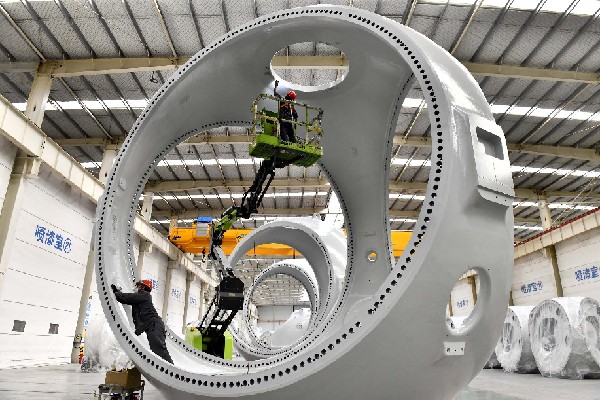 在山東省惠民縣風(fēng)電裝備產(chǎn)業(yè)基地涂裝車間,工作人員對風(fēng)電輪轂進行涂裝。