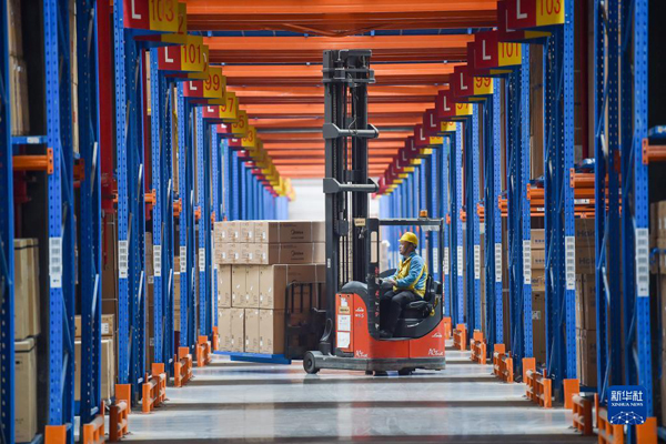 在位于江蘇省南京市江寧區(qū)的蘇寧華東物流中心,工人駕駛叉車搬運(yùn)商品(2022年11月10日攝)。新華社發(fā)(方東旭 攝)