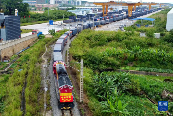 搭載2600噸白糖的中歐班列從南寧國(guó)際鐵路港出發(fā)駛向哈薩克斯坦阿拉木圖(2022年5月15日攝,無(wú)人機(jī)照片)。新華社記者 張愛(ài)林 攝