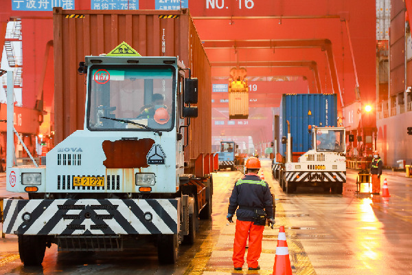 浙江寧波舟山港梅山港區(qū)橋吊在緊張作業(yè)。