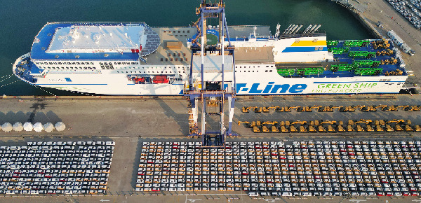 出口商品車在山東港口煙臺港集結(jié)裝船(無人機照片)。