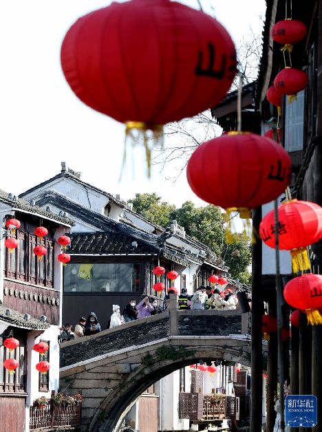 ↑1月27日,游客在江蘇省蘇州市山塘街觀光游覽。新華社發(fā)(杭興微 攝)