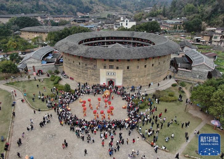 ↑1月25日,游客在福建省龍巖市永定區(qū)土樓景區(qū)觀看民俗表演(無(wú)人機(jī)照片) 。新華社發(fā)(周楊東 攝)