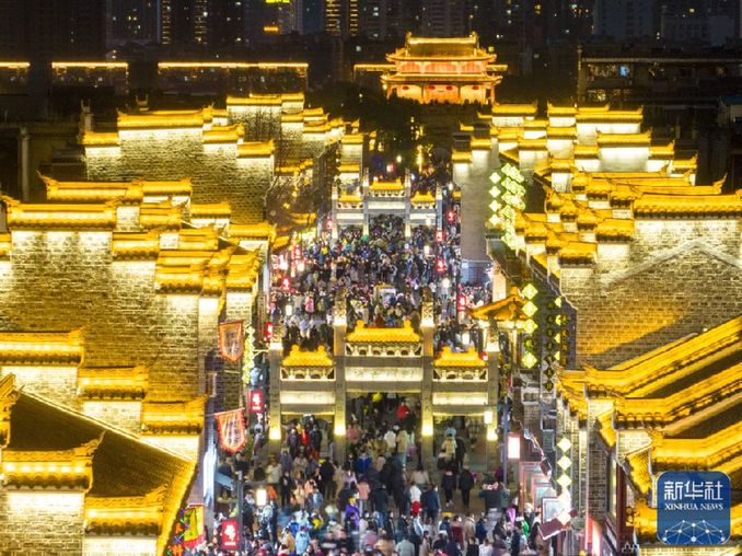 ↑1月27日,游客在湖北襄陽(yáng)古城北街游覽。新華社發(fā)(楊東 攝)