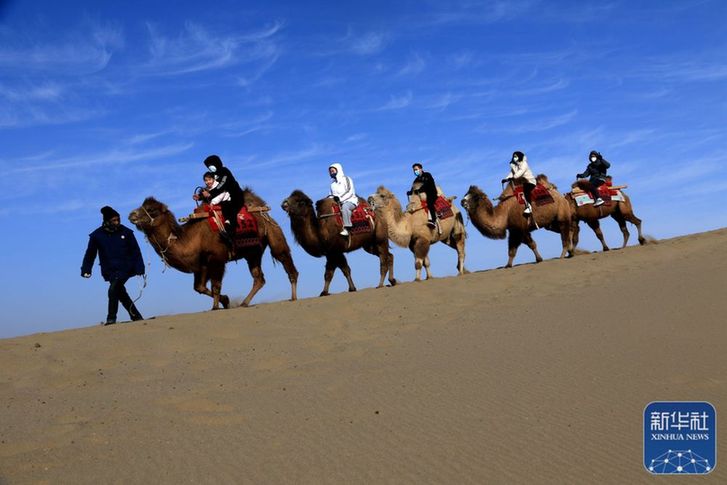 ↑1月27日,游客在甘肅省敦煌市鳴沙山月牙泉景區(qū)騎駱駝?dòng)斡[。新華社發(fā)(張曉亮 攝)