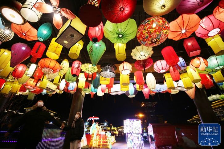 ↑1月27日晚,游客在山東省郯城縣郯國(guó)古城景區(qū)觀看花燈。新華社發(fā)(張春雷 攝)