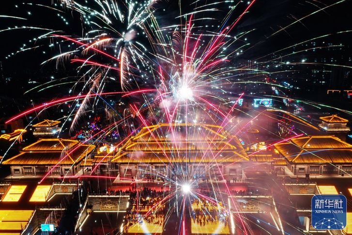 ↑1月27日晚,游客在山東省郯城縣郯國(guó)古城景區(qū)觀賞煙花(無(wú)人機(jī)照片)。新華社發(fā)(張春雷 攝)