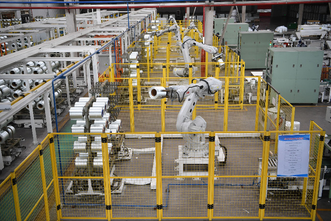 機(jī)械手臂在沙河市一家玻璃制品生產(chǎn)企業(yè)的生產(chǎn)線上工作。 新華社記者 牟宇 攝