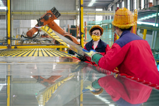 沙河市一家玻璃生產(chǎn)企業(yè)的工人在搬運(yùn)玻璃產(chǎn)品。新華社記者 牟宇 攝