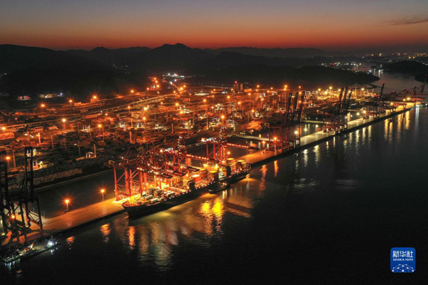 夜幕下,一艘貨輪??吭趯幉ㄖ凵礁鄞┥礁蹍^(qū)集裝箱碼頭(2023年1月31日攝,無人機照片)。2022年寧波舟山港完成年貨物吞吐量超12.5億噸,連續(xù)14年位居全球第一;完成集裝箱吞吐量3335萬標準箱,位居全球第三。新華社記者 黃宗治 攝