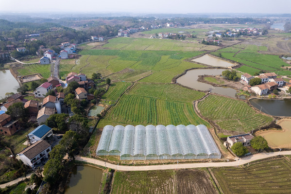 這是2月21日在醴陵市沈潭鎮(zhèn)江田村拍攝的一處新修建的育秧大棚(無人機(jī)照片)。