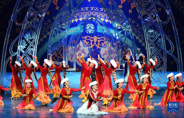 在新疆木卡姆藝術(shù)團(tuán)劇場(chǎng),演員在表演《木卡姆印象》(2017年8月3日攝)。新華社記者 王菲 攝
