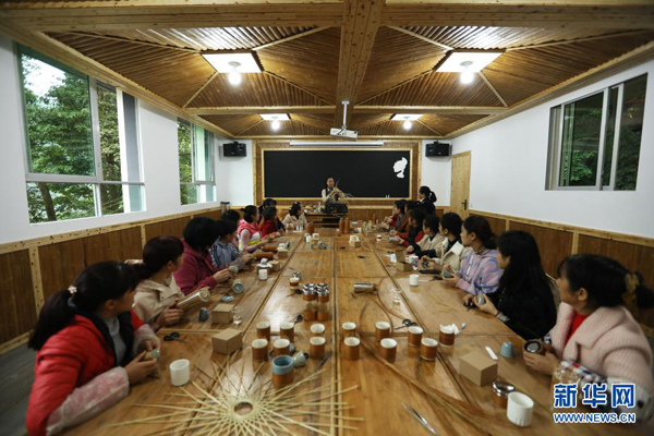 2020年11月5日,在貴州省赤水市大同鎮(zhèn)竹編非遺產(chǎn)學(xué)研基地,楊昌芹(中)在指導(dǎo)學(xué)員學(xué)習(xí)竹編。新華社發(fā)(王長(zhǎng)育 攝)
