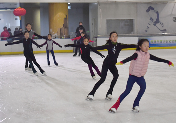 在陜西西安市奧佳冰上運(yùn)動(dòng)俱樂部內(nèi),隊(duì)員們?cè)诰毩?xí)花樣滑冰。(資料照片)