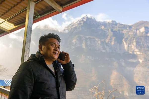 2023年2月14日,在四川省漢源縣永利彝族鄉(xiāng)古路村,鄭望春通過(guò)電話與外地游客溝通來(lái)村里游覽、住宿的事宜。新華社記者 沈伯韓 攝
