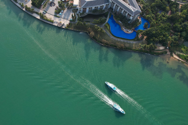 兩艘游船在博鰲東嶼島旅游度假區(qū)相向而行(3月14日攝,無人機(jī)照片)。