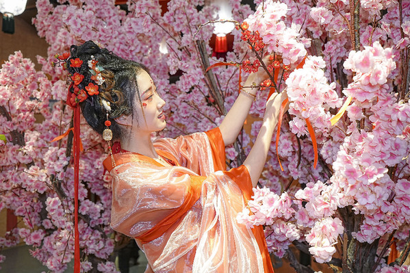 農(nóng)歷二月,恰逢傳統(tǒng)節(jié)日花朝節(jié),位于西安大雁塔腳下的長(zhǎng)安十二時(shí)辰主題街區(qū)里,十二位“花神”蓮步輕搖,伴著絲竹聲聲,在游客的圍觀(guān)下盛裝出場(chǎng),“錦衣霓裳·游長(zhǎng)安”主題活動(dòng)還原古時(shí)踏青賞花風(fēng)俗。如古人“賞紅護(hù)花”一般,街區(qū)向游客發(fā)放紅色綢帶,邀請(qǐng)游客把綢帶系在樹(shù)枝上,表達(dá)對(duì)花朵和春日的贊美?;ǔ屑?,游客做花簪、畫(huà)花扇、品花饌果,感受唐風(fēng)新韻。