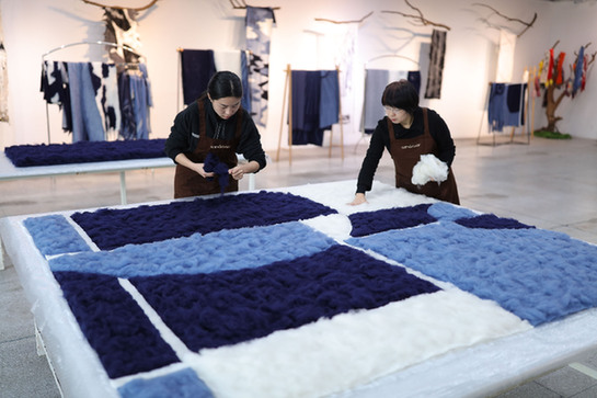 問起“回到源頭”的工藝,最大的訣竅是什么?郭秀玲坦然地說,用手“慢慢地、耐心地拍”。在耐心拍的過程中,不同著色的羊絨,它們的細纖維彼此自然地“拍合”。藝術設計,不再是由流水線說一不二地完成,而是在人手與自然材質的“可能性”中呈現(xiàn)。所以,每一件制品,都是“這一個”,沒有完全雷同的。
