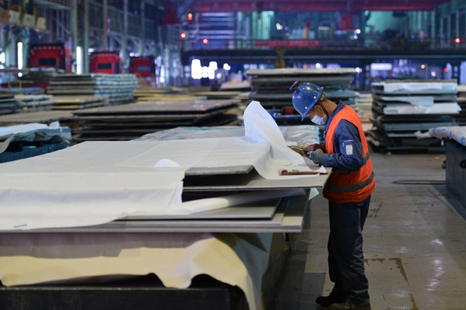 工作人員在酒鋼宏興鋼鐵股份有限公司不銹鋼分公司查看產(chǎn)品信息。記者 范培珅 攝
