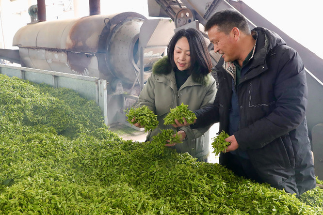 福建省連江縣長龍鎮(zhèn)一家制茶企業(yè)負責人在查看待加工的茶青(3月28日攝)。
