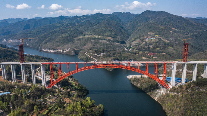 這是3月30日拍攝的德余高速烏江特大橋(無人機(jī)照片)。當(dāng)日,由中交一公局承建的德余高速烏江特大橋主體貫通。該橋位于貴州省思南、石阡、鳳岡三縣交界處,是德江至余慶高速公路的重要控制性工程,全長1834米,主橋?yàn)?04米上承式鋼管混凝土拱橋。