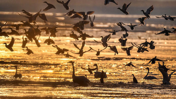 在位于陜西省合陽縣的合陽黃河濕地自然保護(hù)區(qū)內(nèi),群鳥翔集嬉戲(2023年2月3日攝)。新華社發(fā)(趙曉罡 攝)