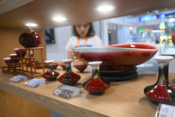 4月8日在第三屆中國國際消費品博覽會展區(qū)拍攝的景德鎮(zhèn)瓷器。新華社記者 蒲曉旭 攝