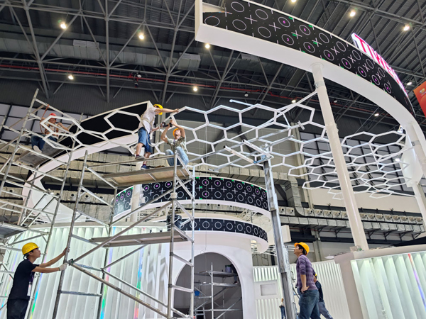 4月6日,工人在第三屆消博會舉辦地海南國際會展中心2號展廳布展。新華社記者 郭程 攝