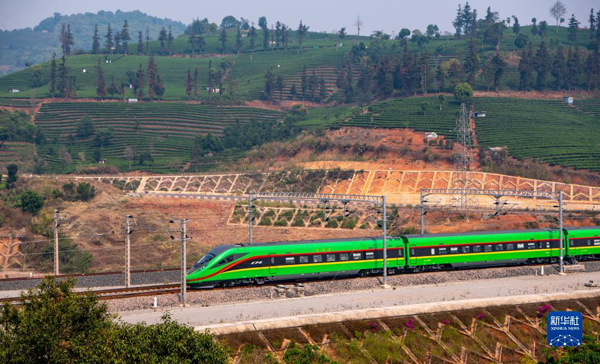 4月13日,首發(fā)列車駛過位于云南省普洱市的一處茶山。新華社記者 江文耀 攝