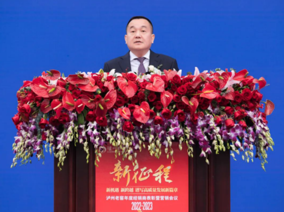 圖為瀘州老窖集團(tuán)及股份公司黨委書(shū)記、董事長(zhǎng)劉淼在2022-2023瀘州老窖年度經(jīng)銷商表彰暨營(yíng)銷會(huì)議上發(fā)言