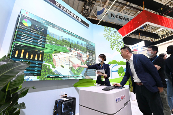工作人員在第六屆數(shù)字中國建設(shè)成果展上介紹數(shù)字高校智慧大腦綜合管理平臺。該平臺由中國電信福州分公司參與打造。
