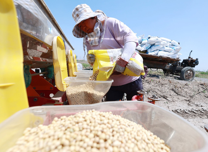 5月24日,唐山市豐南區(qū)王蘭莊鎮(zhèn)的農(nóng)民將準(zhǔn)備播種的大豆種子倒入播種機(jī)。初夏時節(jié),河北省唐山市豐南區(qū)的農(nóng)民搶抓農(nóng)時播種玉米、大豆等農(nóng)作物。該區(qū)今年玉米和大豆播種總面積將達(dá)30萬畝。
