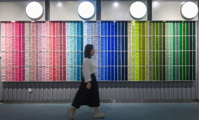 5月25日,游客在參觀大唐襪業(yè)博物館的彩色襪子墻。