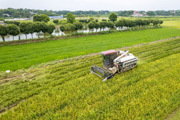 7月4日,在長沙市望城區(qū)茶亭鎮(zhèn)蘇蓼村,收割機在收割早稻。