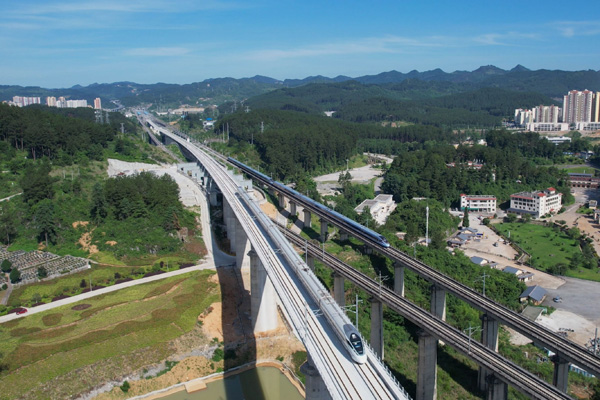 7月5日,參與試驗的55301次列車(左)行駛在貴州省龍里縣境內(nèi)(無人機(jī)照片)。當(dāng)日,55301次試驗列車從貴陽北站駛出,標(biāo)志著貴南高鐵貴州段進(jìn)入按圖行車試驗階段。按圖行車試驗是運(yùn)行試驗的最后階段,主要對調(diào)度指揮、行車組織、列車到發(fā)和設(shè)備狀態(tài)等進(jìn)行全方位、系統(tǒng)性測試。貴南高鐵是黔桂地區(qū)首條設(shè)計時速350公里的高速鐵路。建成通車后,從貴陽至南寧鐵路運(yùn)行時間將從現(xiàn)在的5個多小時縮短至2個小時左右。
