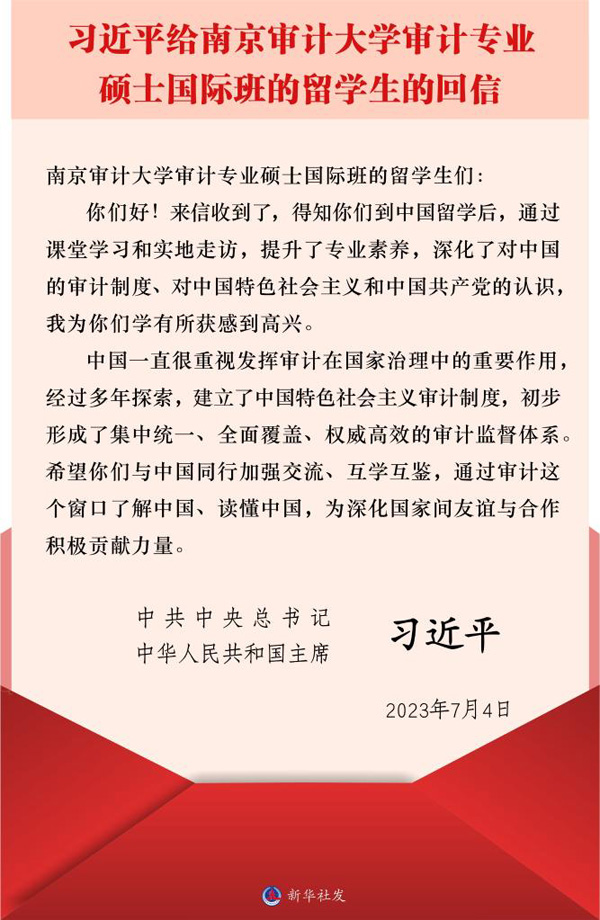 習(xí)近平在回信中說(shuō),得知你們到中國(guó)留學(xué)后,通過(guò)課堂學(xué)習(xí)和實(shí)地走訪,提升了專業(yè)素養(yǎng),深化了對(duì)中國(guó)的審計(jì)制度、對(duì)中國(guó)特色社會(huì)主義和中國(guó)共產(chǎn)黨的認(rèn)識(shí),我為你們學(xué)有所獲感到高興。