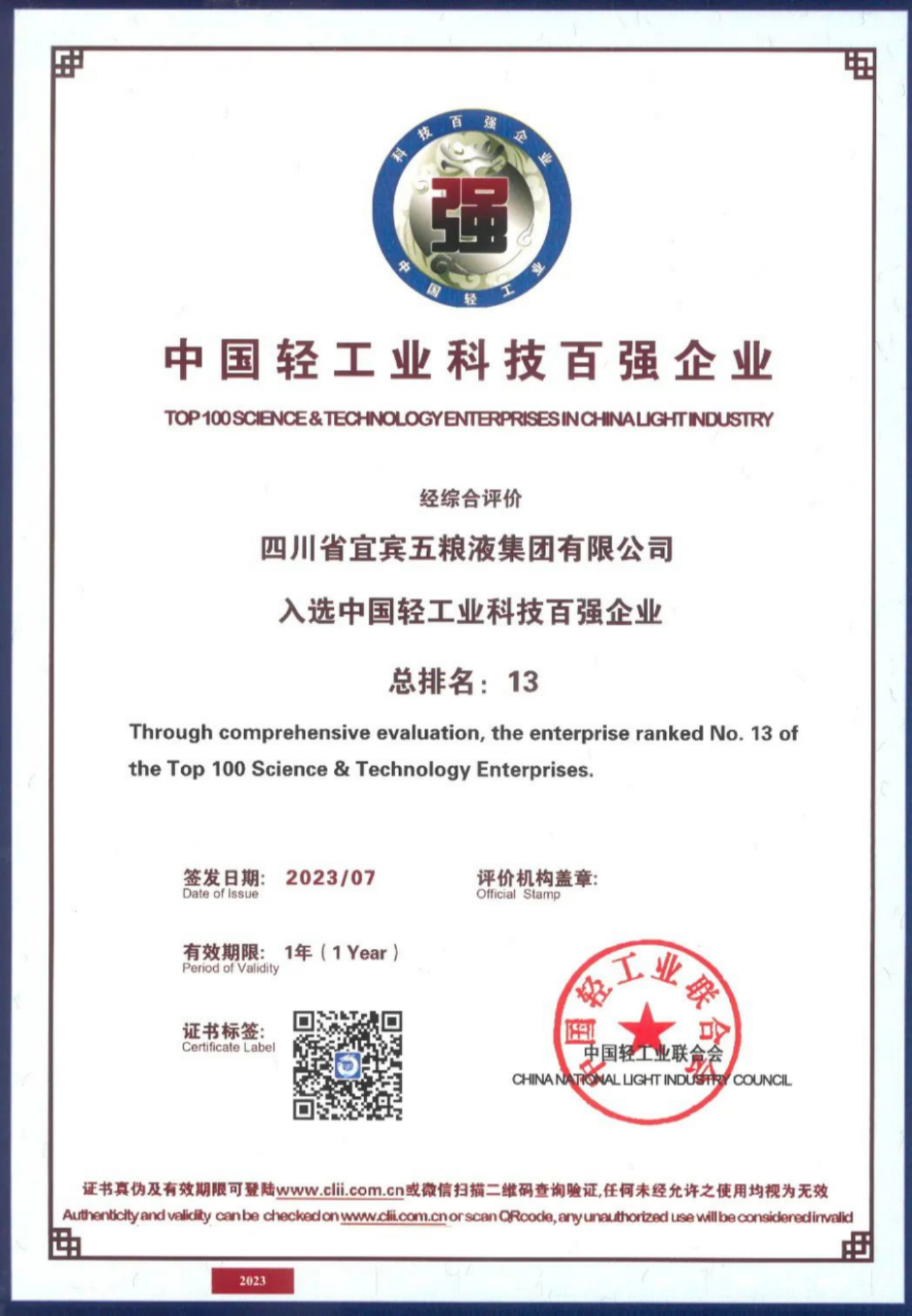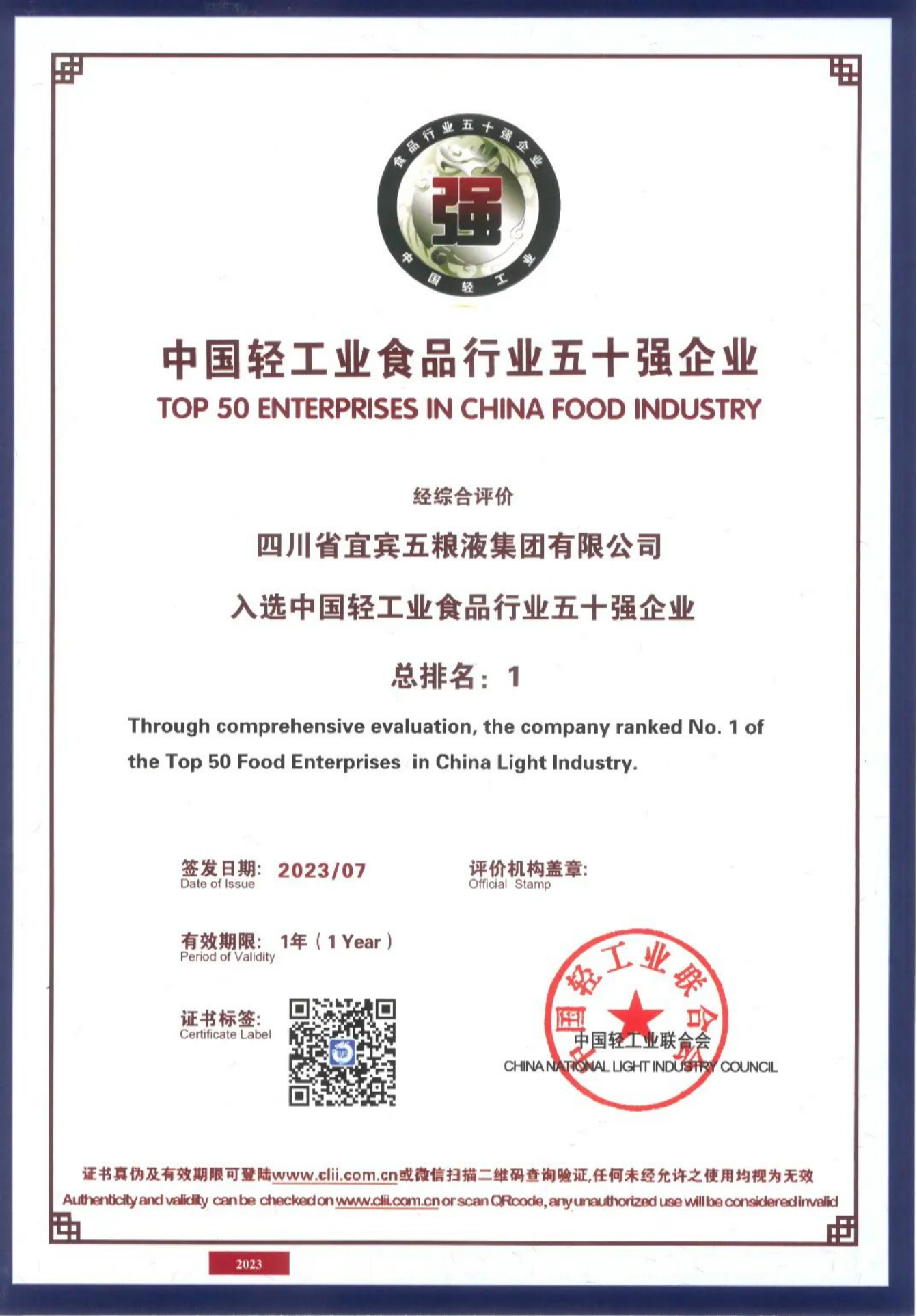 新華財經(jīng)北京7月21日電(李耀威)7月20日,2023年中國輕工業(yè)百強企業(yè)高峰論壇在北京舉行,論壇上發(fā)布了2022年度“中國輕工業(yè)二百強企業(yè)”“中國輕工業(yè)科技百強企業(yè)”“中國輕工業(yè)食品行業(yè)五十強企業(yè)”“輕工裝備制造五十強企業(yè)”名單。五糧液集團(tuán)以酒類行業(yè)最高分名列前茅,位居“中國輕工業(yè)食品行業(yè)五十強企業(yè)”首位、“中國輕工業(yè)二百強企業(yè)”第四位、“中國輕工業(yè)科技百強企業(yè)”第十三位。