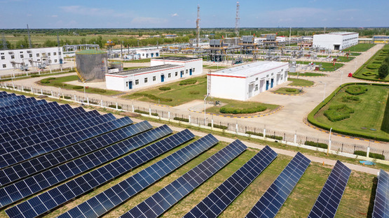 長慶油田第五采氣廠蘇里格天然氣第六處理廠廠區(qū)內(nèi)的光伏發(fā)電站。  記者 王鵬 攝