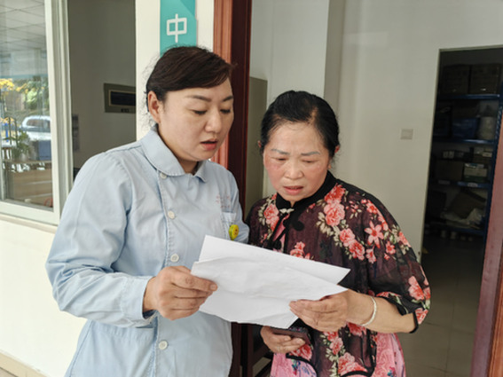 在成都回龍社區(qū)日間照料中心,成都八院護(hù)士喬雪蓮在給社區(qū)老人看體檢單。 記者 董小紅 攝
