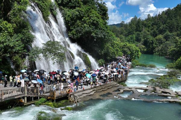 日前,前往貴州省荔波小七孔風(fēng)景區(qū)游玩的游客激增,景區(qū)各部門(mén)通力合作,服務(wù)游客,每天迎客超過(guò)6.2萬(wàn)人次。