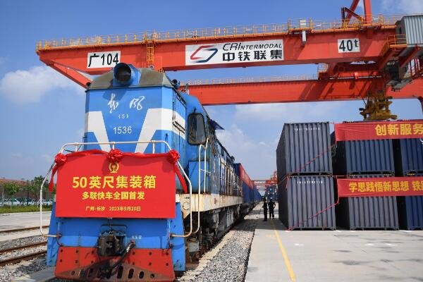 當(dāng)日,搭載50英尺集裝箱的鐵路多聯(lián)快車分別從上海閔行站、廣州國際港站、長沙北站、昆明王家營西站始發(fā),將常態(tài)化投入鐵路貨物運(yùn)輸。50英尺集裝箱由國鐵集團(tuán)自主研發(fā),比40英尺國際標(biāo)準(zhǔn)箱容積增加50%,是目前國內(nèi)容積最大的集裝箱。本次四地始發(fā)的50英尺集裝箱鐵路多聯(lián)快車采用“干線鐵路運(yùn)輸+兩端快速集配”的組織模式,為終端客戶提供全程物流服務(wù),最高運(yùn)行時(shí)速120公里。該型號集裝箱投入使用后,將極大增強(qiáng)我國內(nèi)陸集裝箱運(yùn)輸能力,大幅降低物流成本。