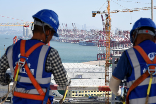 國(guó)慶長(zhǎng)假期間,在位于中國(guó)(山東)自由貿(mào)易試驗(yàn)區(qū)青島片區(qū)的航運(yùn)貿(mào)易金融融合創(chuàng)新基地項(xiàng)目上,600多名建設(shè)者堅(jiān)守一線,搶抓施工黃金期,奮力沖刺項(xiàng)目建設(shè)關(guān)鍵節(jié)點(diǎn)。圖為中鐵建工建設(shè)者在進(jìn)行外墻吊裝施工準(zhǔn)備。新華社記者 李紫恒 攝