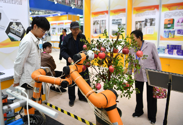 參觀者被第30屆楊凌農(nóng)高會上的一款采摘機器人吸引。