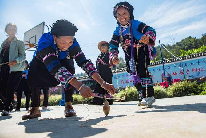 10月22日,云南省文山壯族苗族自治州馬關(guān)縣木廠鎮(zhèn)楊茂松村村民在重陽(yáng)節(jié)活動(dòng)中打陀螺。