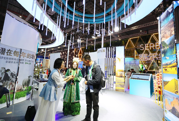 11月6日,一名參觀者(右)在第六屆進博會國家展哈薩克斯坦展臺與工作人員交談。第六屆進博會國家展全面恢復(fù)線下舉辦,洪都拉斯、塞爾維亞、越南、南非、哈薩克斯坦作為本屆進博會主賓國在國家展亮相?!⌒氯A社記者 方喆 攝