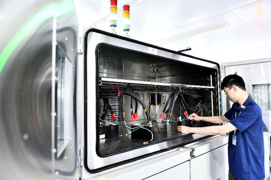 在棗莊市國家鋰電池產(chǎn)品質(zhì)量檢驗(yàn)檢測中心,工作人員對鋰電池進(jìn)行檢驗(yàn)。資料照片
